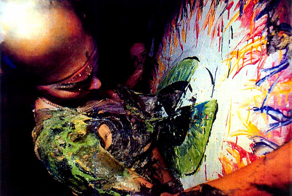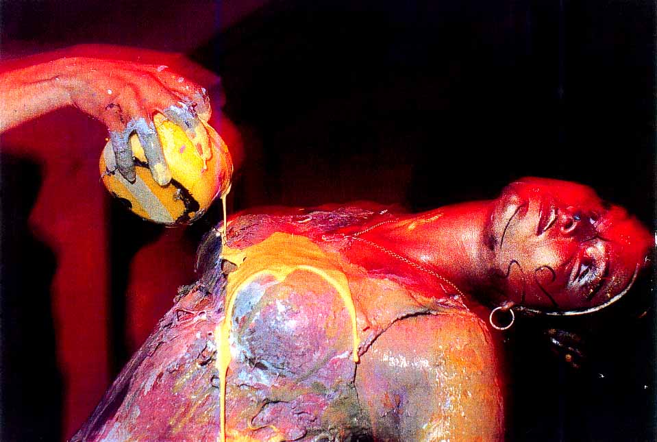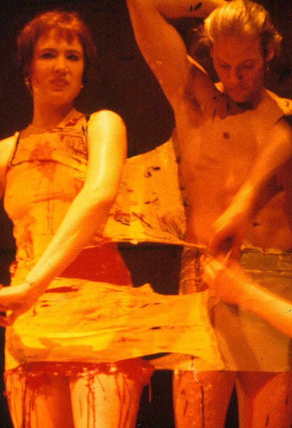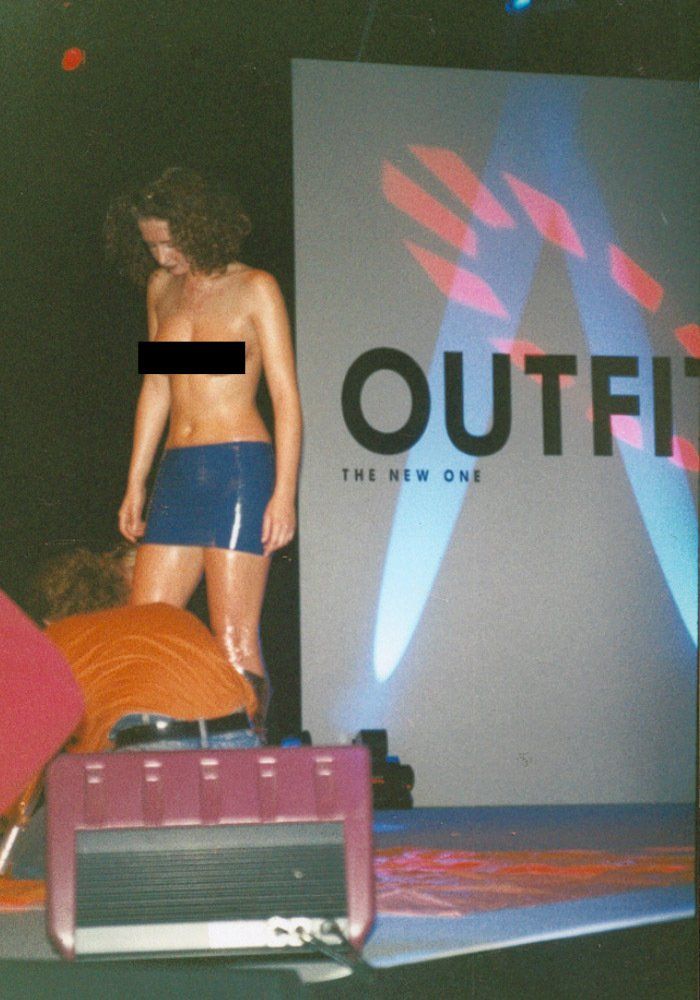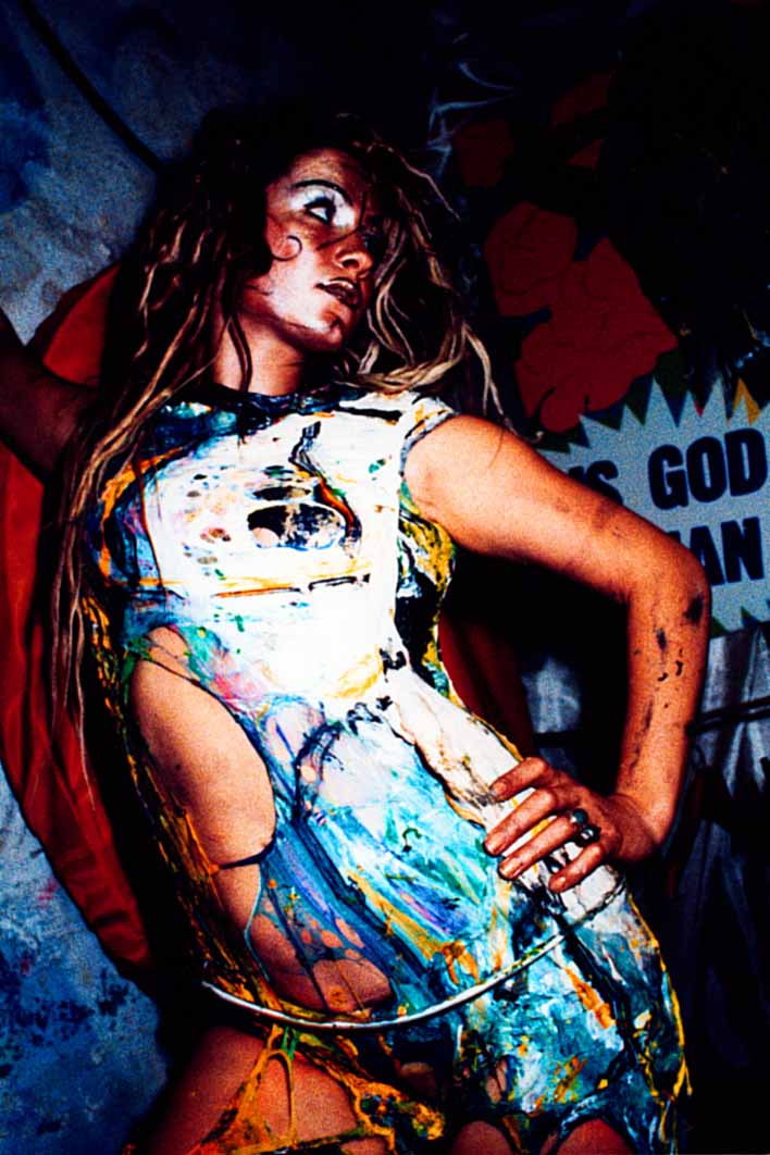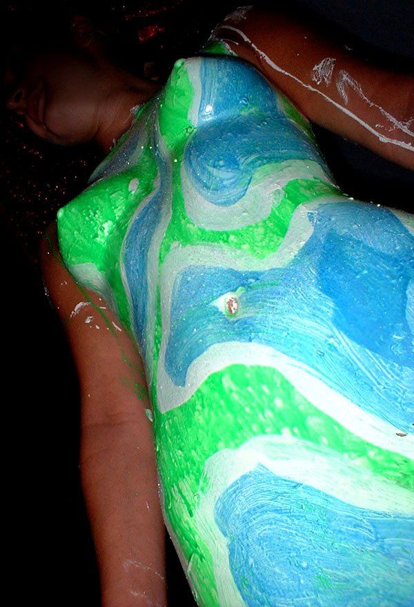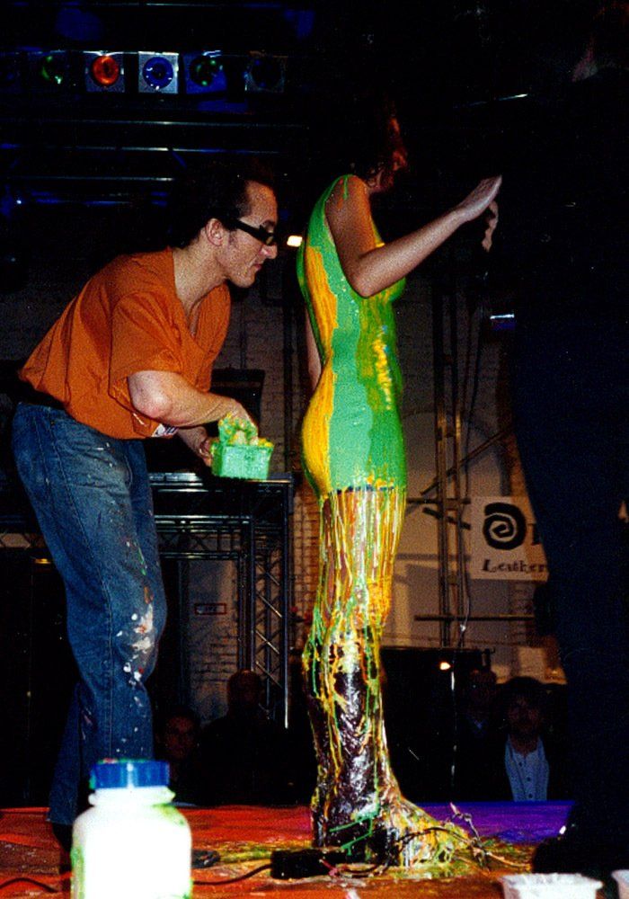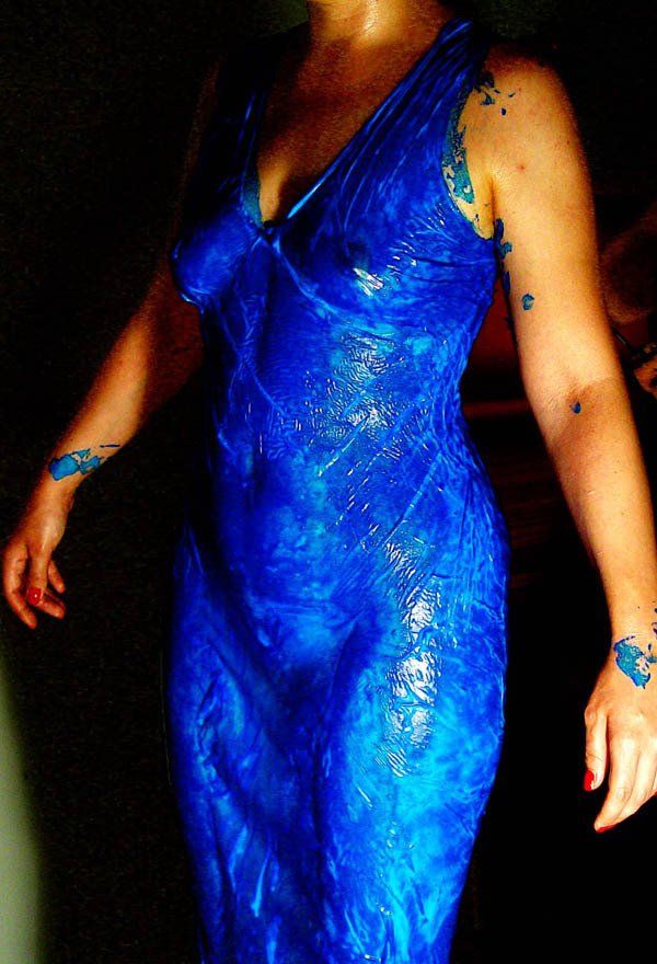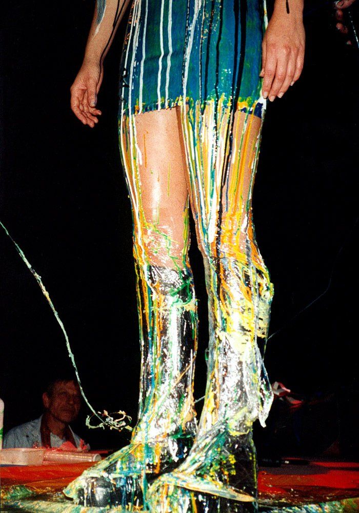 Hier ging es nicht darum fertige, tragbare Kleider herzustellen, sondern um das Spiel mit dem Material Flüssiglatex am Körper der Models in Bewegung. Verlaufende Farben, die Veränderung des Materials beim Trocknen. Absichtliches zerstören, reissen lassen, zusammenkleben, übertragen von Schichten von einer auf eine andere Person.